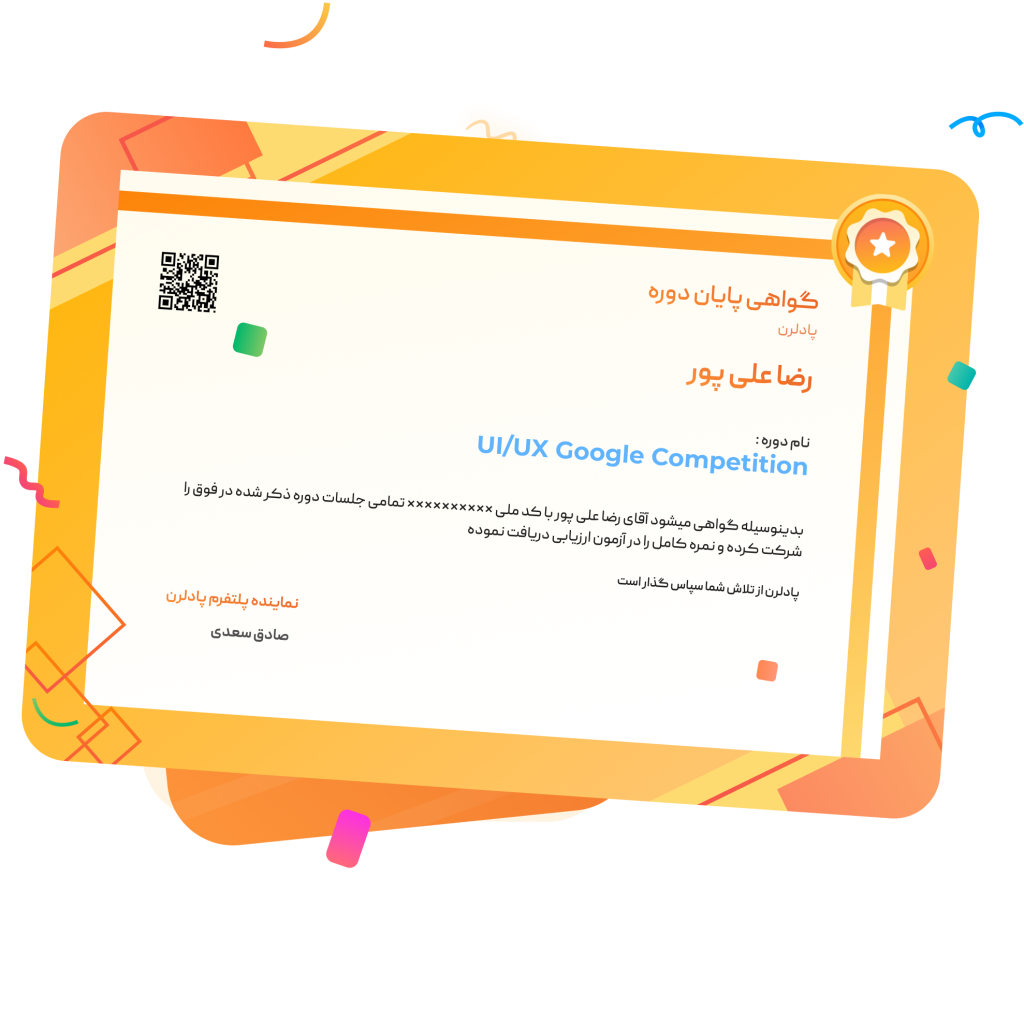 با اتمام دورههای مختلفی که پاد لرن ارائه میدهد، شما به دستاوردهای خود گام بزرگی برای رسیدن به موفقیت حرفهای میاندازید. گواهینامههایی که این وبسایت صادر میکند، تضمین کننده مهارتها و دانش کسب شده توسط شما در زمینه برنامه نویسی و طراحی در حوزه تکنولوژی اطلاعات است.